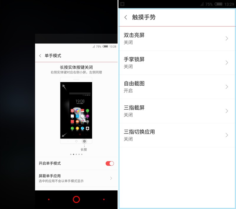 屏幕下方,仍然留了三颗触摸式的按键,Home键仍保留着小红点的设计样式,值得一提的是该小红点还具备呼吸灯提醒作用。而返回键和多任务菜单键则设置在Home的左右对称两侧,这两颗按键采用了隐藏式的设计(具备背光灯,使用时发光可见),而且用户可以自由选择两颗按键对应的功能,如可以选择左侧或右则按键作为返回键。